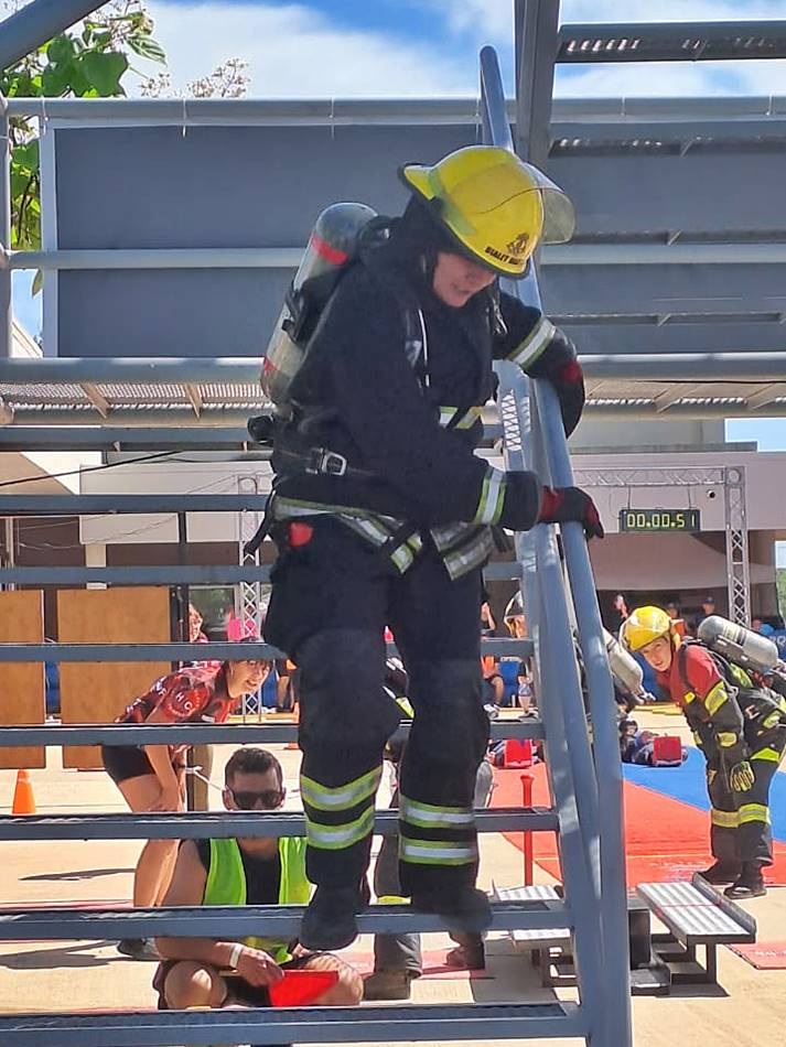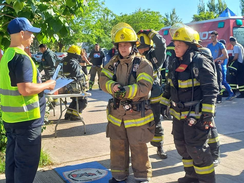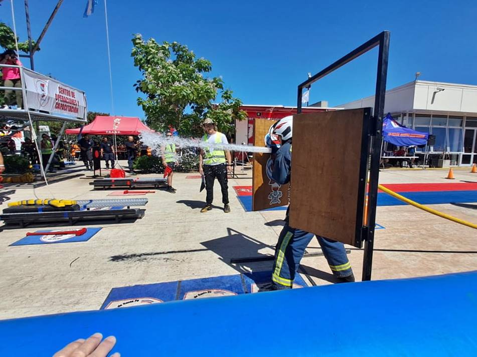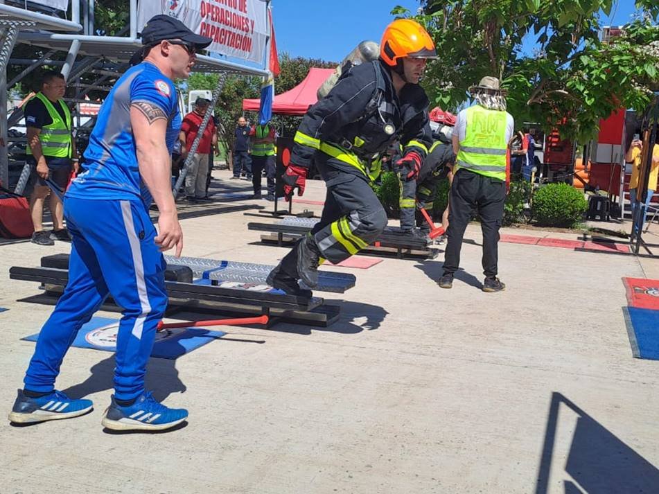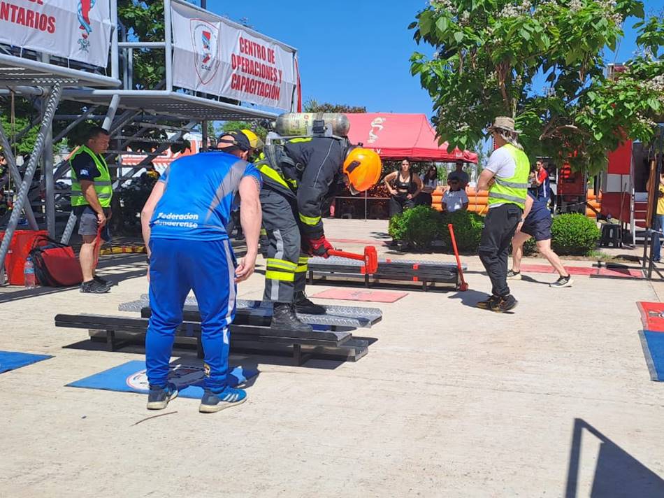 Los ejercicios que realizan en competencia «son un ejercicio estandarizado a nivel mundial para que compitan los bomberos, que simula las destrezas que tenemos que tener para el trabajo nuestro. Con el equipo completo de incendio y de respiración, el participante debe hacer cinco pisos de escalera con 20 kilos al hombro, levantar 20 kilos con una soga, bajar, golpear un yunque de 70 kilos por un metro, hacer un slalom y avanzar 25 metros con la manguera cargada, para finalmente rescatar un muñeco de 80 kilos agarrándolo de las axilas, corriendo para atrás 25 metros».