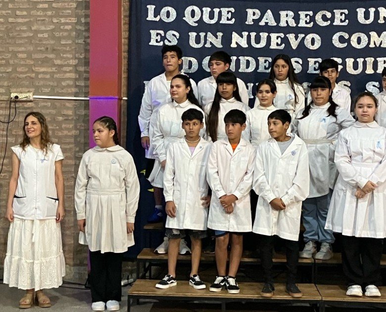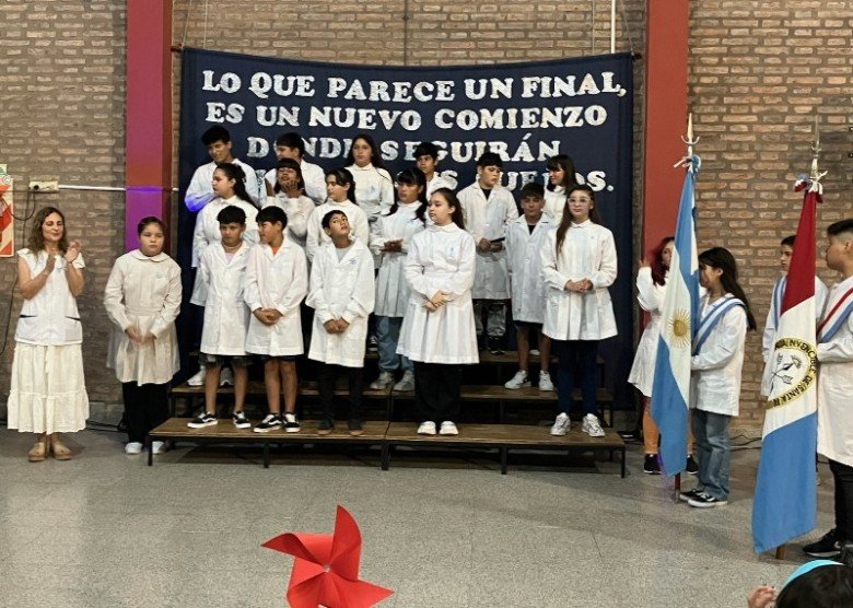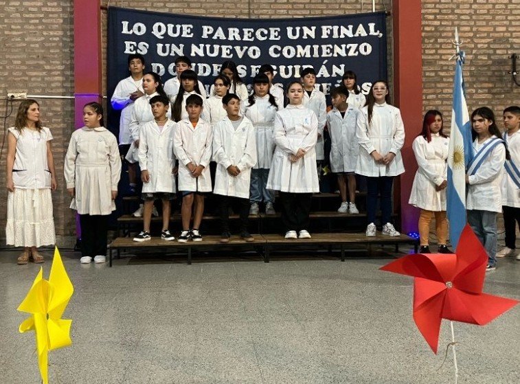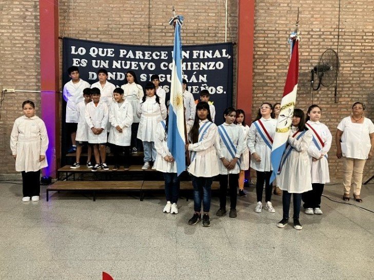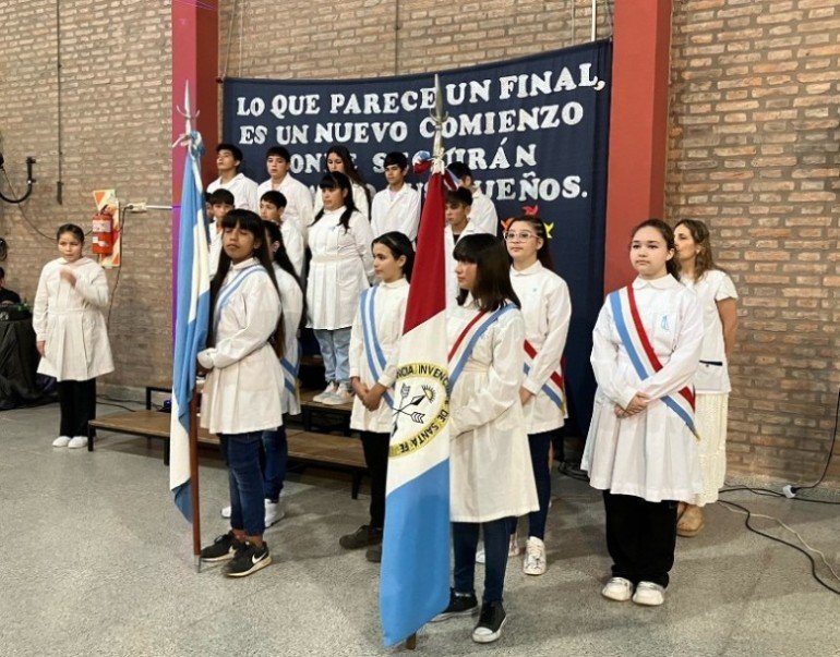 Durante la ceremonia se dieron a conocer los nuevos abanderados quienes serán los encargados de portar las Banderas el próximo ciclo lectivo 2024. Abanderada de la Bandera de la Nación para el ciclo lectivo 2024, la alumna Génesis Villarruel, acompañada por Tiago Riquelme y Josefina Rodríguez. Bandera de la Provincia Dilan Aranda Alma Ramallo y Aaron Denis.
