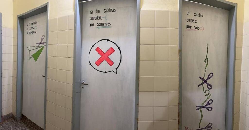 En la intervención «participamos todos los estudiantes. Nosotros hicimos la propuesta de intervenir las puertas en la fiesta, invitamos a todos los cursos a participar y nos sorprendió un montón… Habíamos visto que un mensaje negativo atraía al resto a seguir escribiendo cosas negativas y quisimos hacerlo a la inversa con mensajes positivos. La consigna fue y después de un año, cuando fuimos a ver las puertas, nos dimos cuenta que no había más mensajes negativos, que era todo colores, que siguieron pintando y ésa era la idea, por lo que nos dimos cuenta de que funcionó».