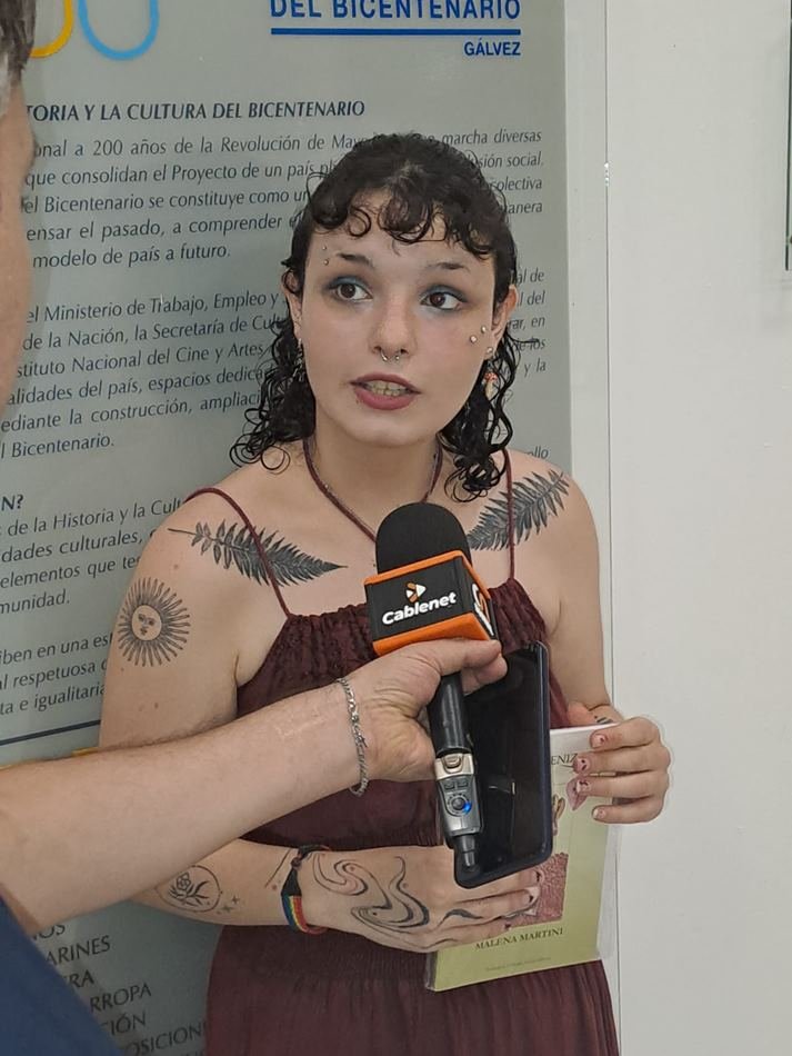 En la tarde-noche de este lunes, Malena Martini -con sólo 19 años y en la ciudad natal de su mamá, porque actualmente viven en La Rioja- presentó su libro «DESDE LAS CENIZAS». «Estuvimos haciendo toda una gira… Mi primera presentación fue el 11 de noviembre, que fue el lanzamiento del libro en La Rioja Capital y se hizo en un museo… Siempre tratamos de hacerlo en museos o casas culturales, donde el arte pueda llegar a personas del lugar, no únicamente del ámbito artístico, sino que las personas lleguen y lean, o hagan arte», sostuvo, recordando que ya estuvo presentando su primer material «en el sur, Río Gallegos, Ushuaia, en Buenos Aires aún no pudimos, y nos contactamos acá, con Gálvez, para ver si nos daban la oportunidad, y por suerte surgió la posibilidad de hacerlo en la Casa de la Historia y la Cultura».