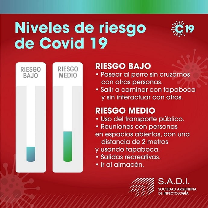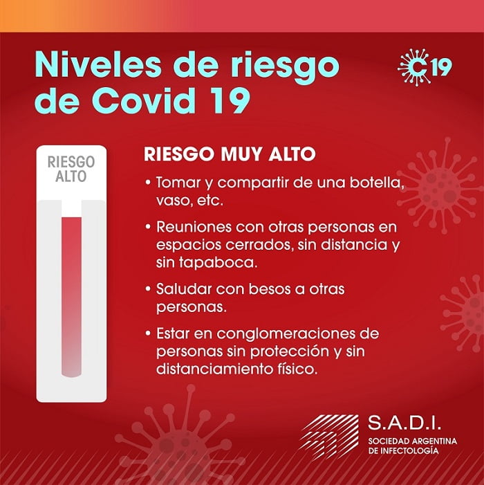 La Sociedad Argentina de Infectología (S.A.D.I.) difundió una serie de placas dando detalles sobre los niveles de riesgo de contagio de Covid-19 que implican actividades cotidianas como hacer compras, caminar, abrazar, dar la mano, o compartir mate.