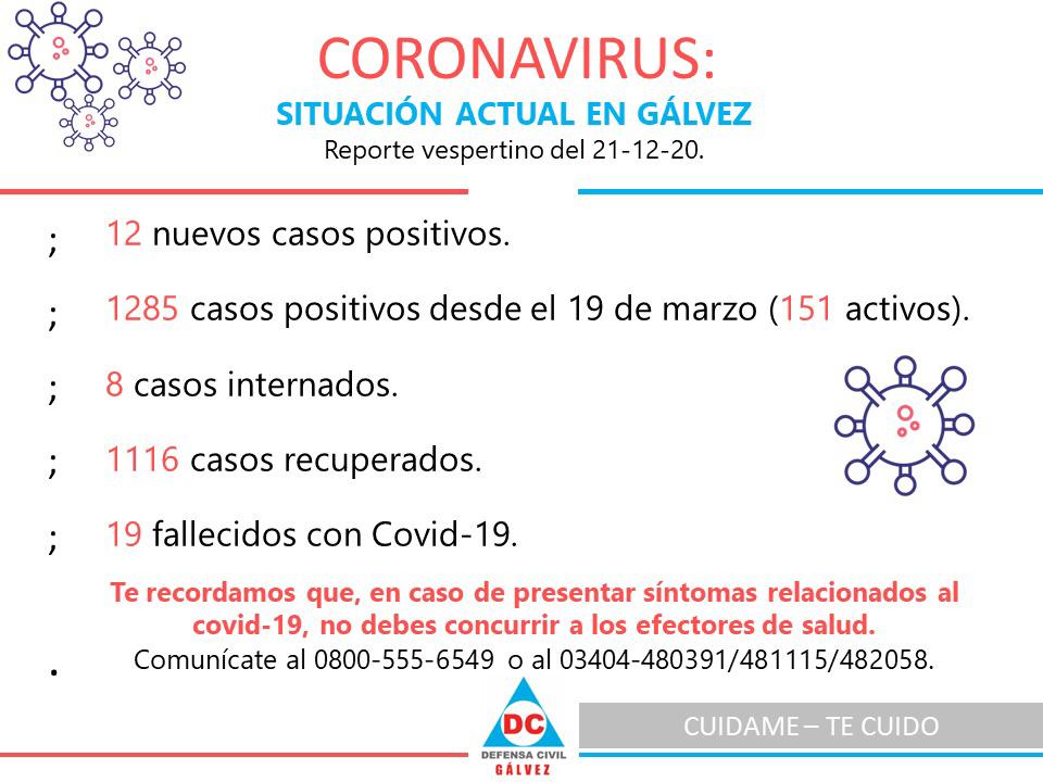 La Junta de Defensa Civil informó el lunes por la noche que se registraron 12 nuevos casos de Covid-19 en la ciudad. De esta manera, el total de positivos desde el comienzo de la pandemia asciende a 1285 casos de los cuales 151 están activos.