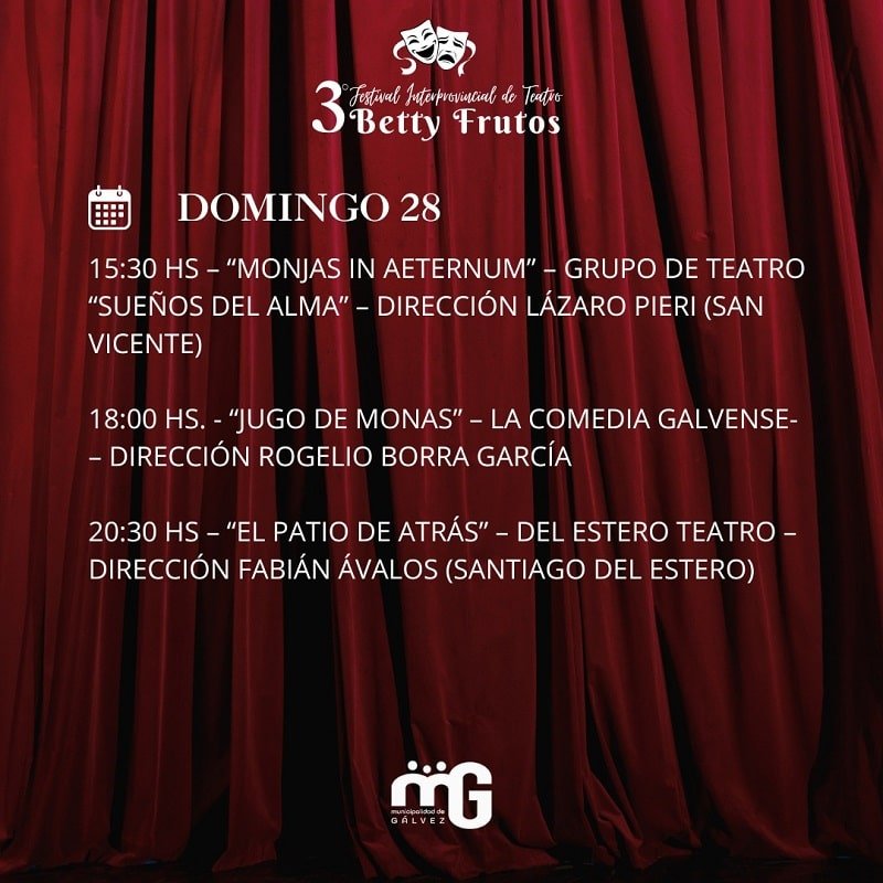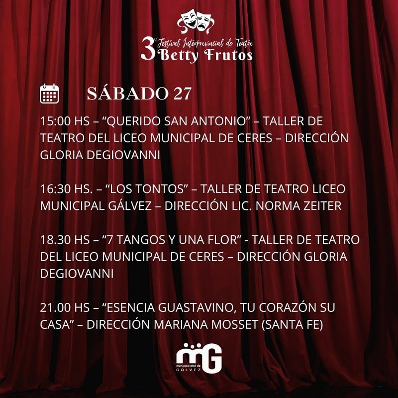 «Ahora se viene la tercera edición del Festival Interprovincial de Teatro BETTY FRUTOS… Betty fue una actriz galvense, transgresora, curiosa, que realmente ha hecho mucho por esta actividad artística para nuestra ciudad, y en su memoria, vamos a tener tres jornadas de puro teatro este viernes, sábado y domingo», indicó Mariel, remarcando que «para mantener la calidad y la categoría interprovincial, vamos a tener la visita de un elenco de la ciudad de Santiago del Estero, lo que va a ser el día domingo».