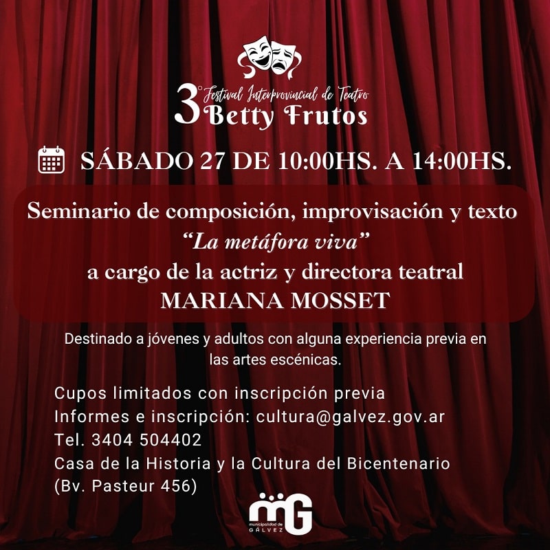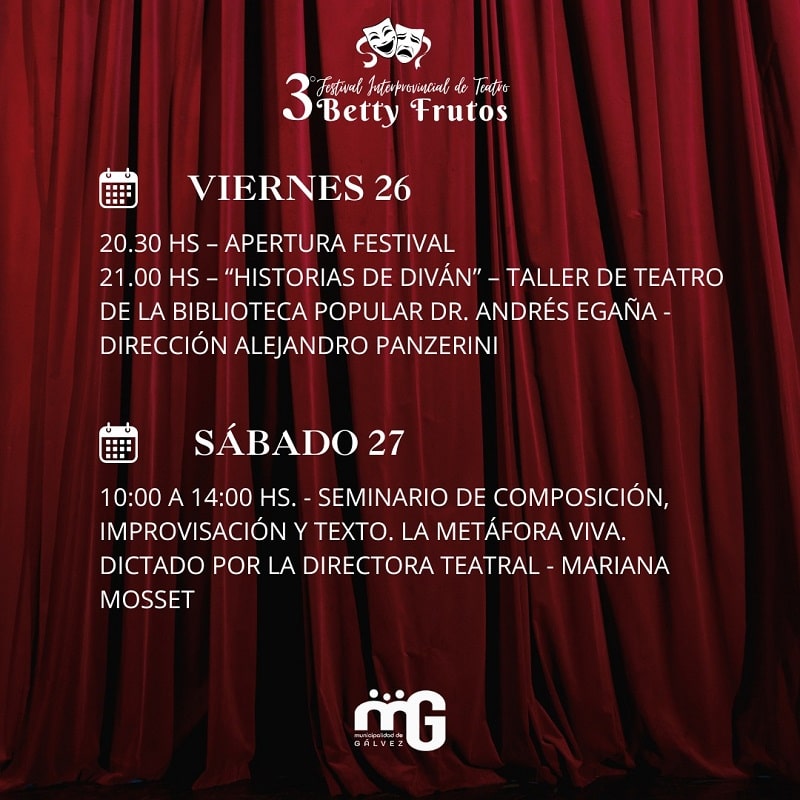 «Ahora se viene la tercera edición del Festival Interprovincial de Teatro BETTY FRUTOS… Betty fue una actriz galvense, transgresora, curiosa, que realmente ha hecho mucho por esta actividad artística para nuestra ciudad, y en su memoria, vamos a tener tres jornadas de puro teatro este viernes, sábado y domingo», indicó Mariel, remarcando que «para mantener la calidad y la categoría interprovincial, vamos a tener la visita de un elenco de la ciudad de Santiago del Estero, lo que va a ser el día domingo».