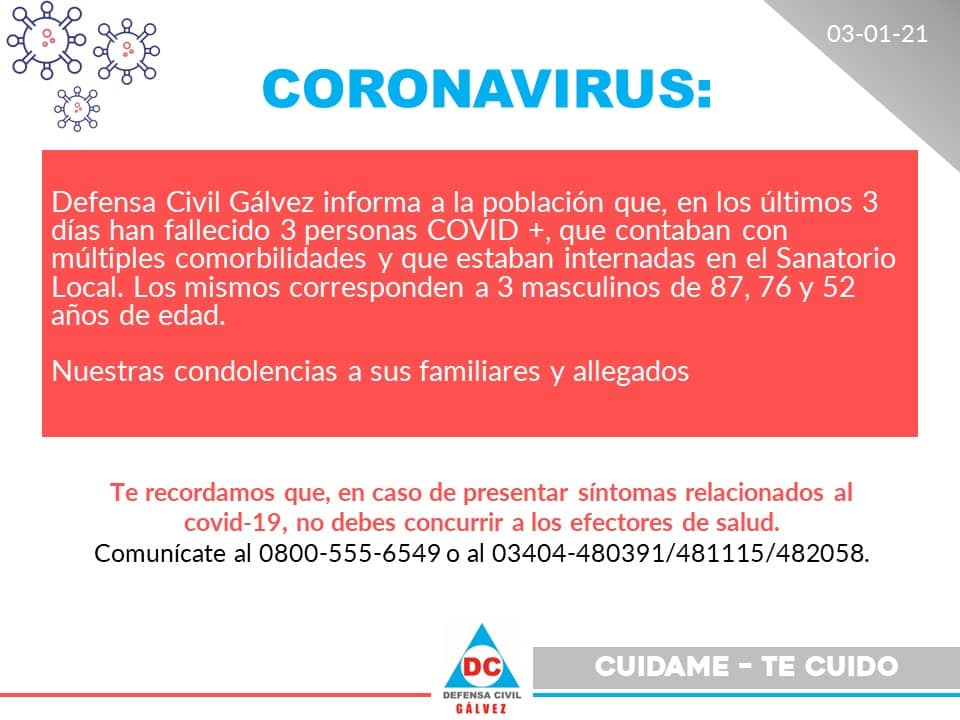 Además se informó que en los últimos tres días fallecieron tres personas con COVID +, que contaban con múltiples comorbilidades y que estaban internadas en el Sanatorio local. Los decesos corresponden a tres masculinos de 87,76 y 52 años.