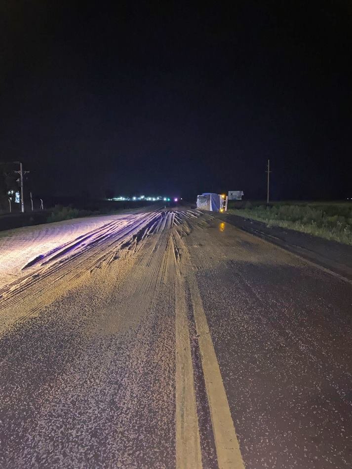 En la madrugada de hoy, pasada las 02:00h, policías de Comando Radioelectrico trabajaron en ruta 80 a unos 6km. aproximadamente, al cardinal este, frente a AFA, ya que un camión despistó y volcó su acoplado perdiendo la carga de cereal.