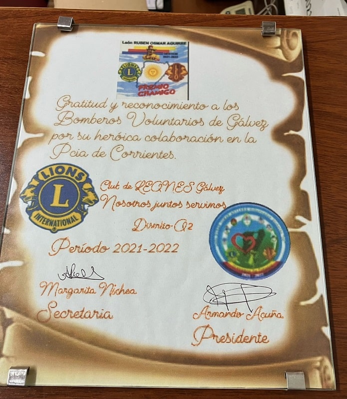 Integrantes del Club de Leones «Gálvez» hicieron entrega de un reconocimiento a los Bomberos Voluntarios que estuvieron participando de los incendios forestales de Corrientes y Misiones. El acto se desarrolló este sábado por la mañana en las instalaciones del Cuartel en calle Mitre y fueron destacados los bomberos Juan Ignacio Lanzo, Santiago Cesano, Emanuel Premet y Hernán Paleo.