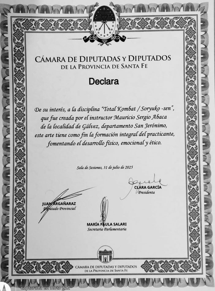 El profesor de artes marciales Mauricio Abaca, fue reconocido días atrás por la Cámara de Diputados y Diputadas de la provincia. Esta declaratoria de interés la recibió por ser el creador de un nuevo arte marcial llamado Total Kombat.