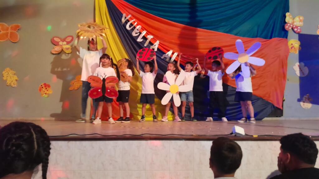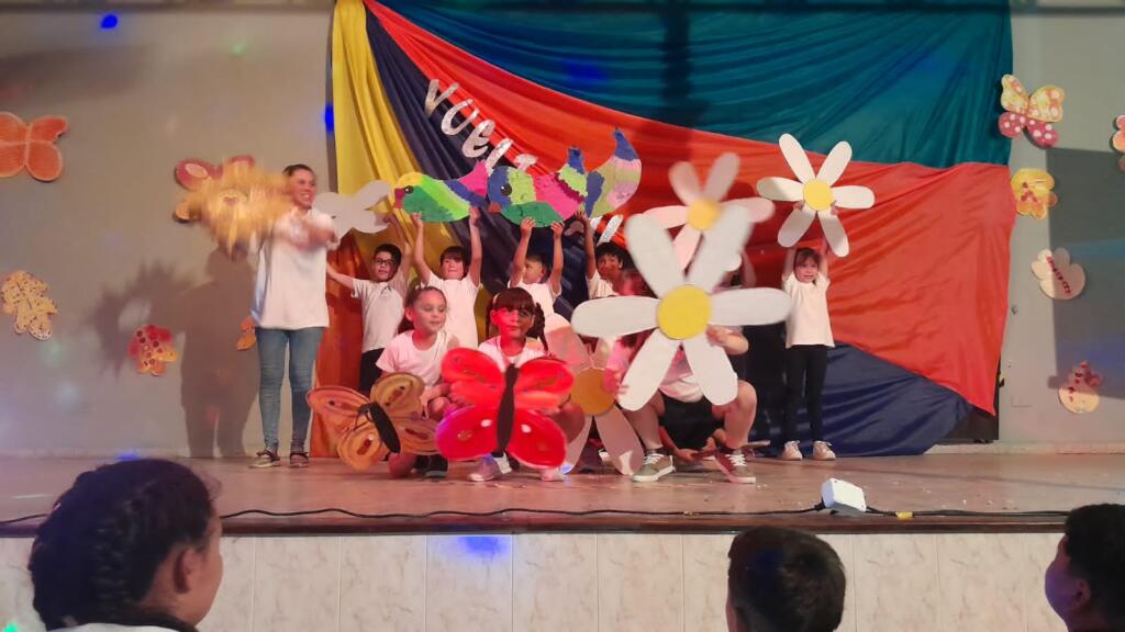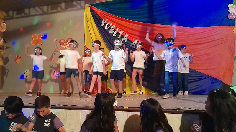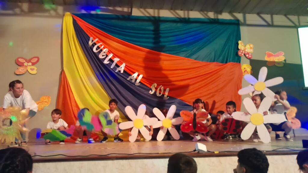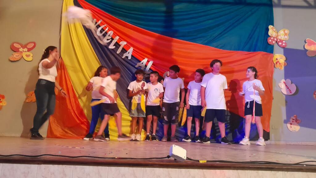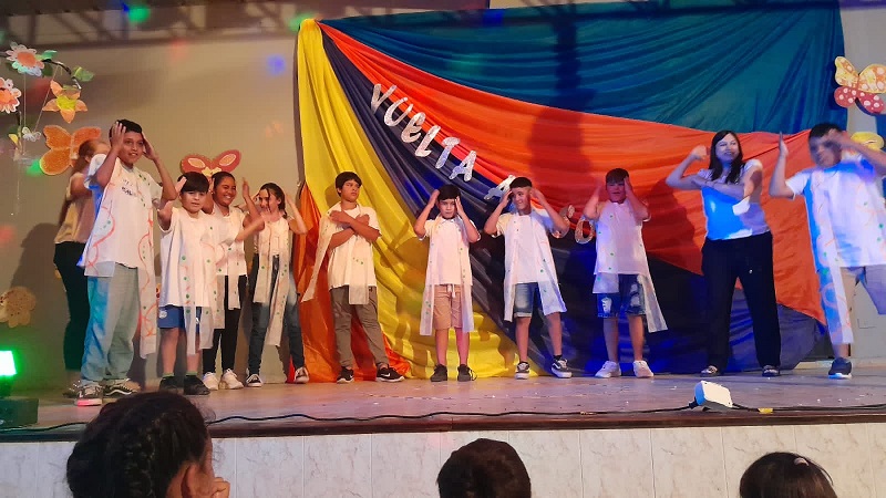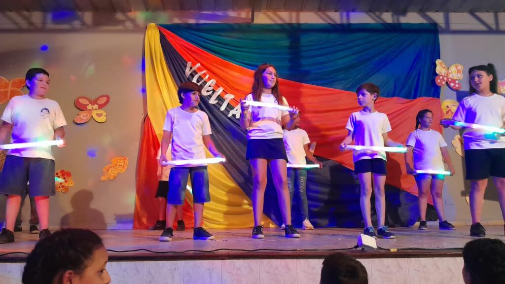 En un trabajo articulado también participaron las disciplinas como lengua y matemática con el acompañamiento del plantel directivo. Con gran alegría, música y mucho color, de 1ro a 7mo pasaron por el escenario para dar una «Vuelta al sol».