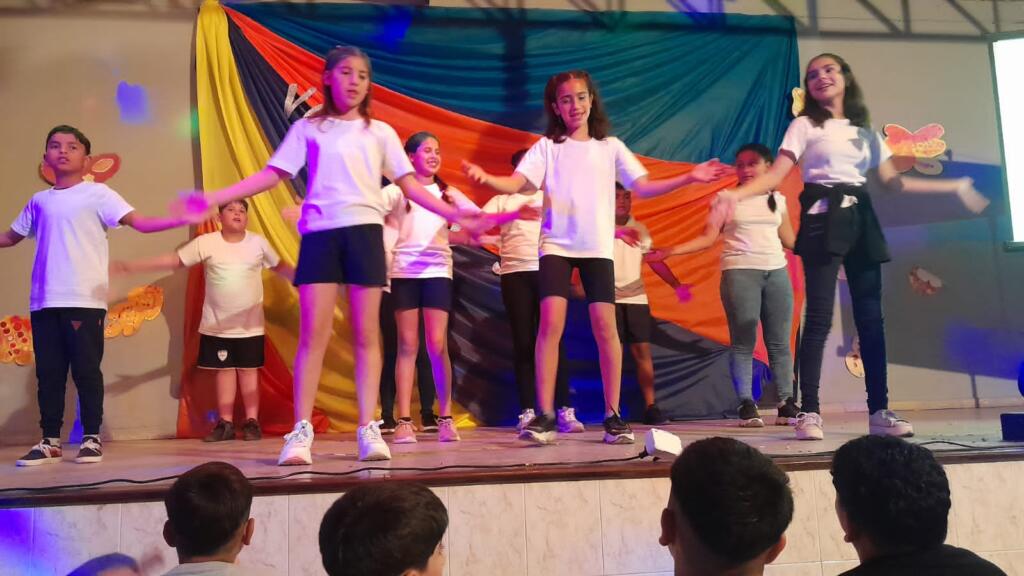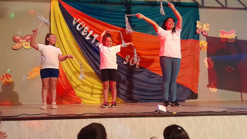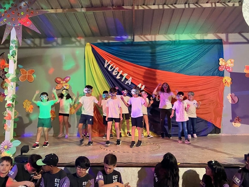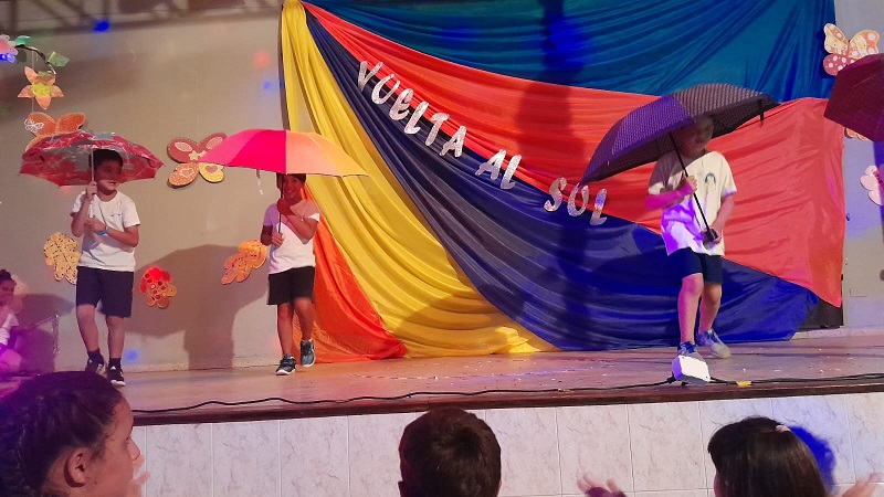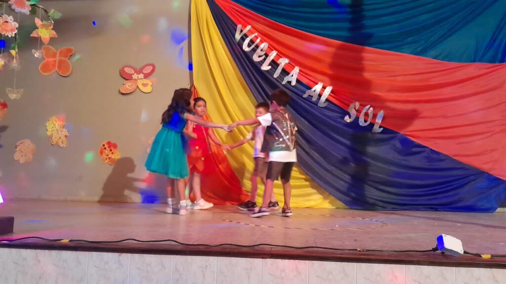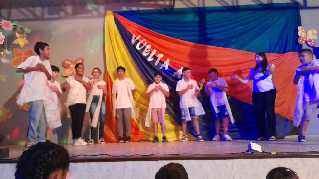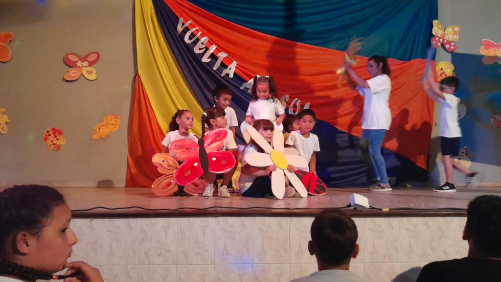 En un trabajo articulado también participaron las disciplinas como lengua y matemática con el acompañamiento del plantel directivo. Con gran alegría, música y mucho color, de 1ro a 7mo pasaron por el escenario para dar una «Vuelta al sol».