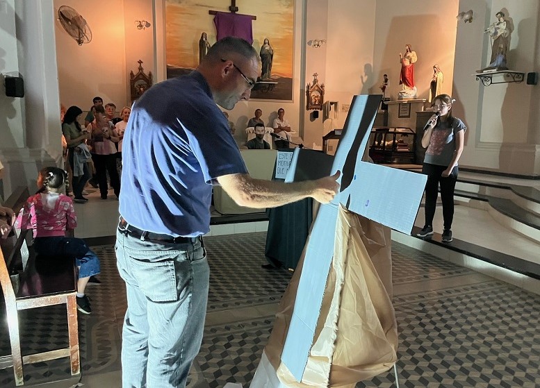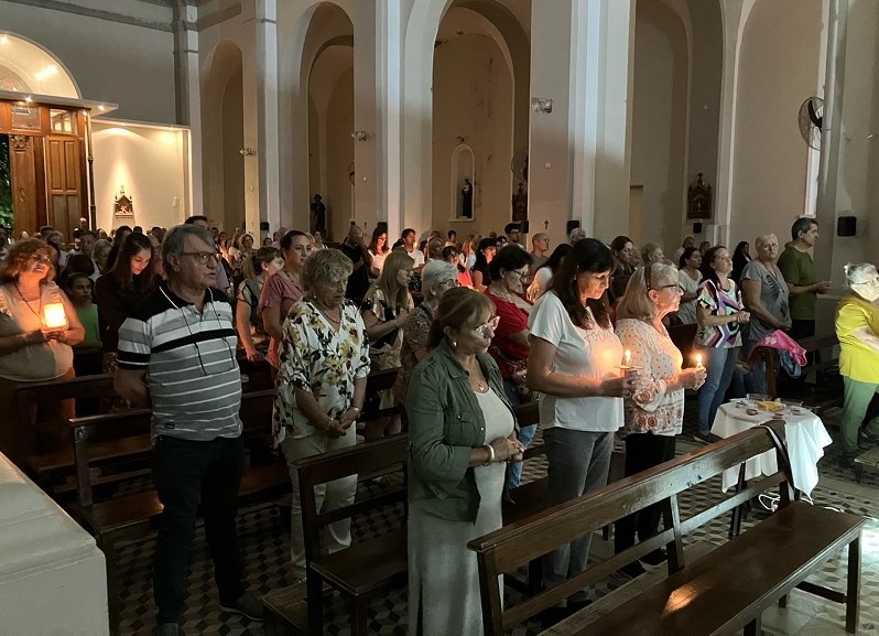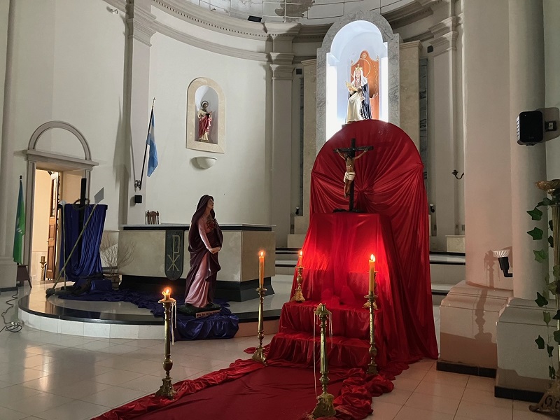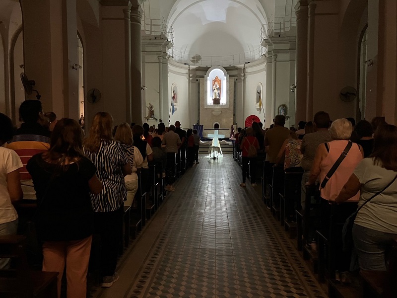 Una vez en el Templo el Padre Carlos Magnano invitó a los fieles a sumarse a una dinámica porque «hoy estamos dentro del sepulcro, solamente hay silencio, hay una persona muerta y un misterio que se está revelando. Este día nos invita a entrar en el sepulcro de nuestro corazón porque cuando mis manos, mi corazón, mi voluntad peca le vuelvo a armar la cruz a Jesús», señaló.