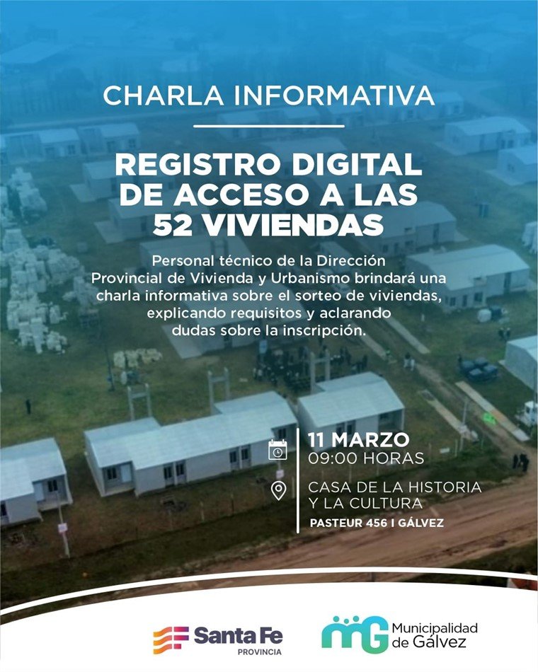 En la tarde de este lunes, desde el Municipio local se informó una novedad importante respecto al barrio de 52 viviendas que se estarían entregando este año en la ciudad. «El próximo miércoles 11 de marzo, en la Casa de la Historia y la Cultura, se realizará una charla informativa acerca del registro digital. La misma estará a cargo del personal técnico de la Dirección Provincial de Vivienda y Urbanismo. Recordemos que hay una decisión del gobierno provincial de continuar, de terminar y de que las viviendas lleguen a toda la comunidad de Gálvez. A partir de allí, mantuvimos reuniones junto a nuestro intendente Mariano Busso con el secretario de Hábitat, el señor Lucas Crivelli, y empezamos con plazos administrativos», indicó la secretaria de Desarrollo Humano Sandra Sabach, quien brindó conferencia de prensa junto a Matías Báscolo, del Área Legal y Técnica de la Municipalidad. «Estamos en esta instancia de poder realizar una charla informativa para toda la comunidad -continuó-, y desde allí es muy importante que a través de los medios e información que iremos acercando desde el Municipio para la gente que no haya realizado aún la inscripción, o para quien ya esté inscripto, puedan acercarse y evacuar todas las dudas».