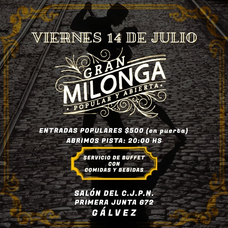 La primera edición de la «Milonga Popular y Abierta» se realizará este viernes 14 de julio a las 20 horas en el Salón del Centro de Jubilados y Pensionados, en calle Primera Junta 672.