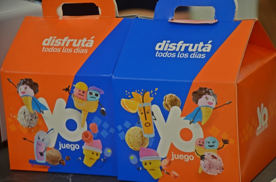 En YO, se encuentran «desde el helado tradicional, en cucuruchos y en tacitas, hay kilos, medio kilo, cuartos, y también todo lo que es envasado, desde bombones escocés, bombón escocés blanco, casattas, el tradicional tricolor que le llamamos nosotros, bombón suizo, tortas, baldes de kilo y medio, de medio kilo, hay helados para diabéticos, hay helados para celíacos, y luego toda una rama de lo que es palitos y postres individuales, con muchísima variedad».