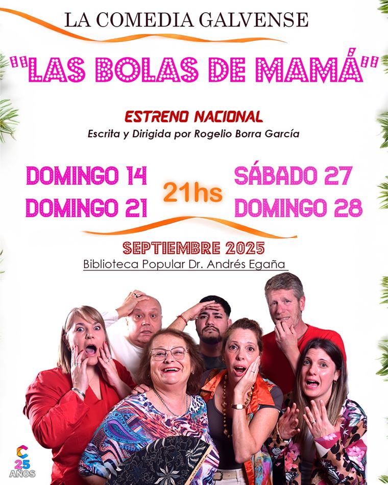 “Las Bolas de Mamá” integra la programación teatral diseñada para este año, con motivo del 25° aniversario de La Comedia Galvense, celebrado a puro teatro, con cuatro obras en cartelera a lo largo del año y este estreno nacional como broche de oro de este ciclo aniversario, que cuenta con el acompañamiento del Gobierno de la Provincia, Vicegobernadora Gisela Scaglia.