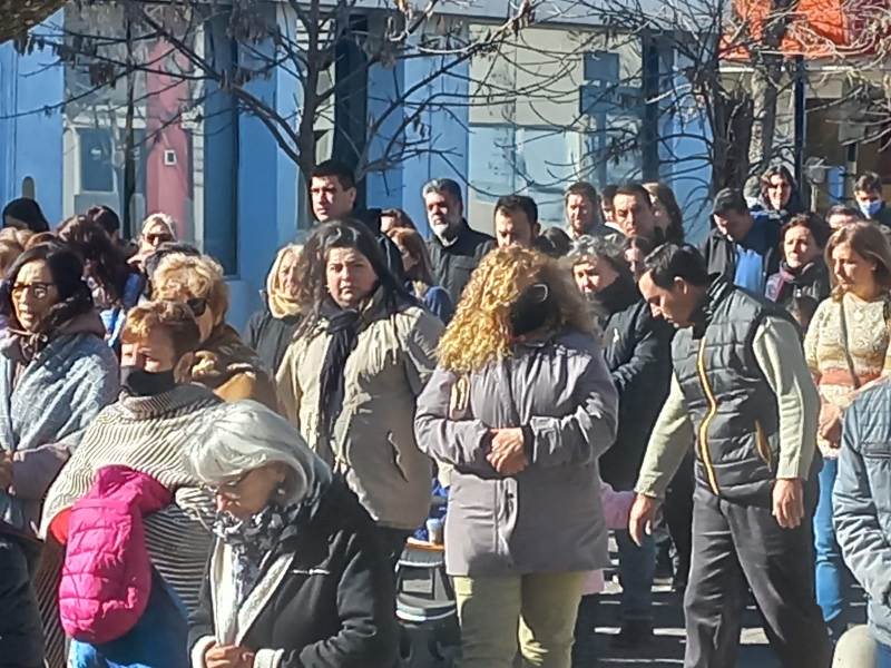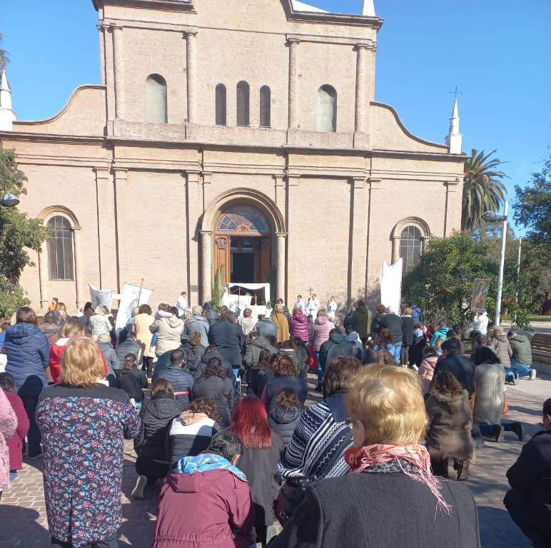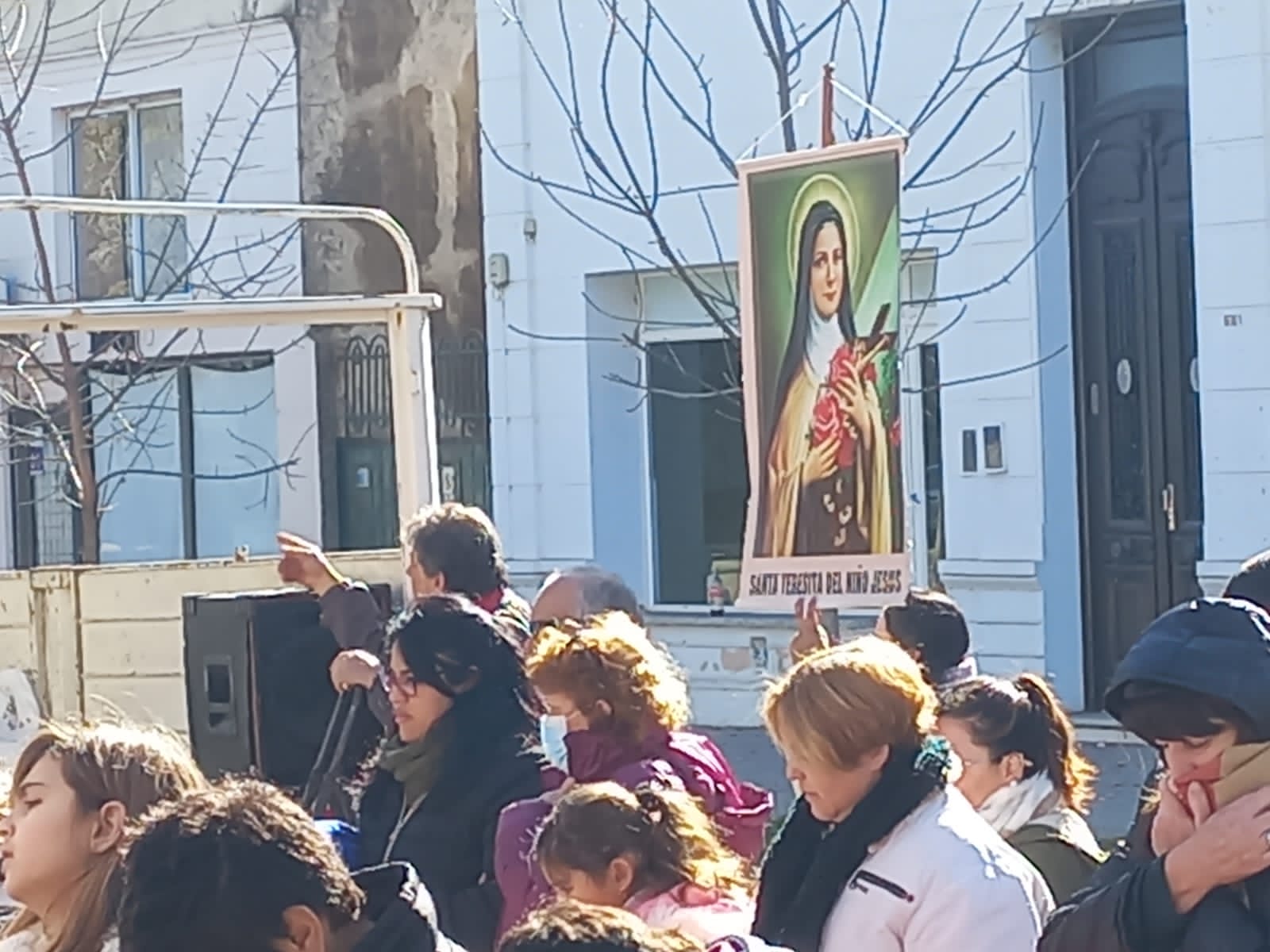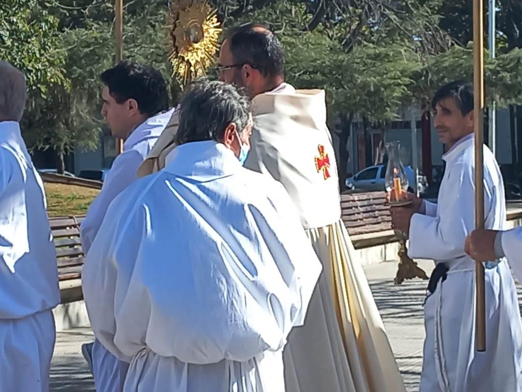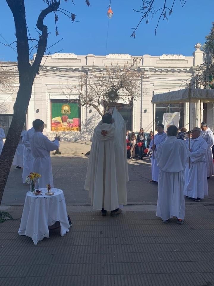 Con la presencia de Cristo en la Eucaristía, el Padre Carlos Magnano fue el encargado de impartir la bendición en cada punto cardinal durante el recorrido que partió desde la Parroquia hasta Av. de Mayo para llegar a calle San Martín, luego Rivadavia regresando al Templo.