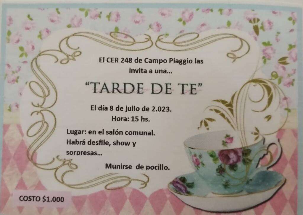 El CER 248 de Campo Piaggio organizó una «TARDE DE TE» el pasado sábado. El SUM Comunal fue el lugar elegido donde se dio cita una gran cantidad de público que pasaron un entretenido momento con desfile, show musical, sorteos y sorpresas.