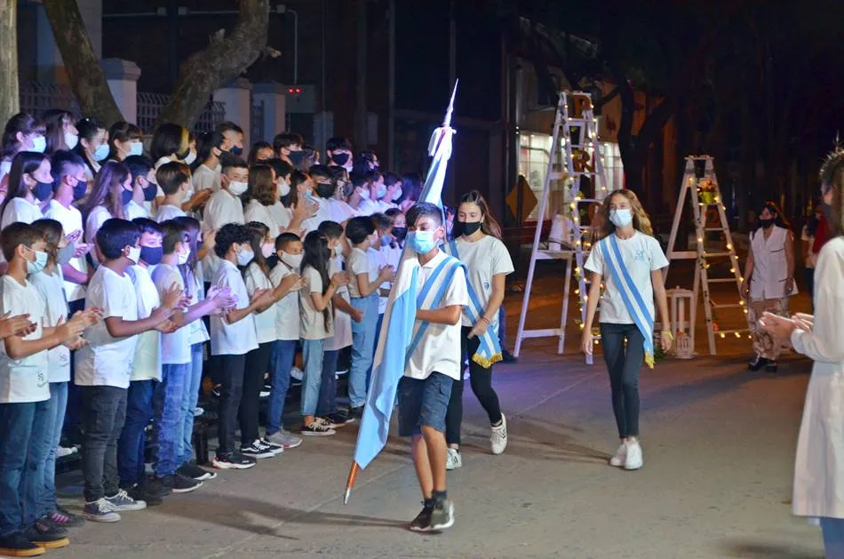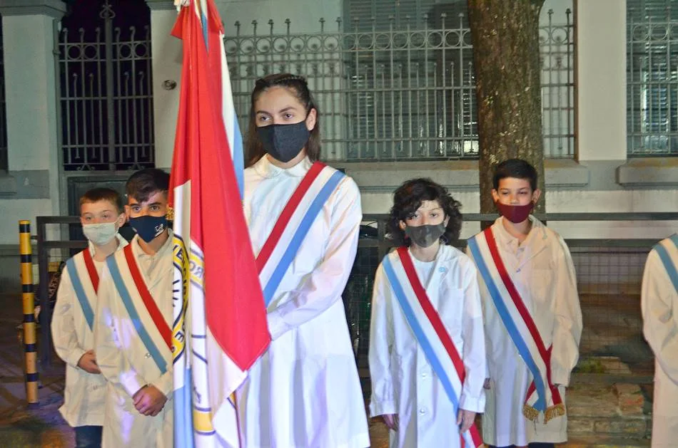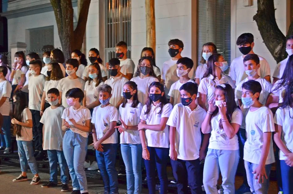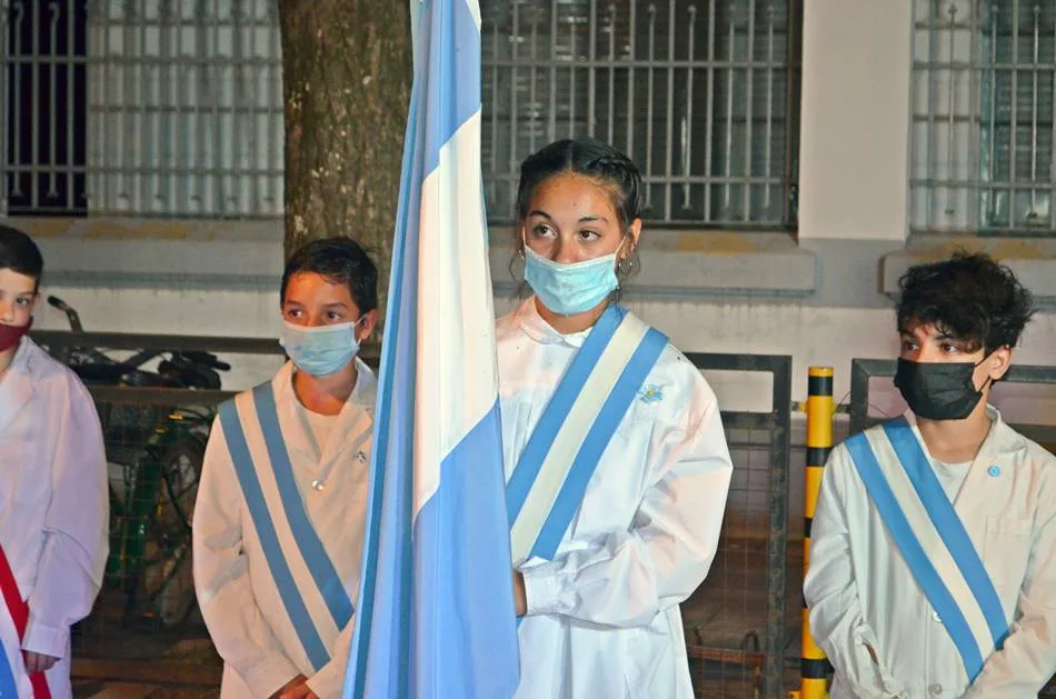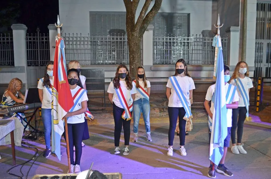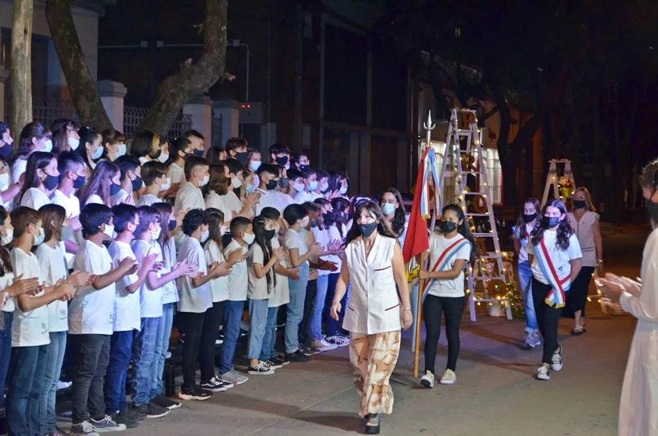 El himno nacional fue interpretado por las docentes Mariel Cabo y Andrea Bruno, del Liceo Municipal, y antes del discurso de despedida, se realizó el tradicional cambio de abanderados. Luego sí, los chicos recibieron el hasta siempre desde la entidad.