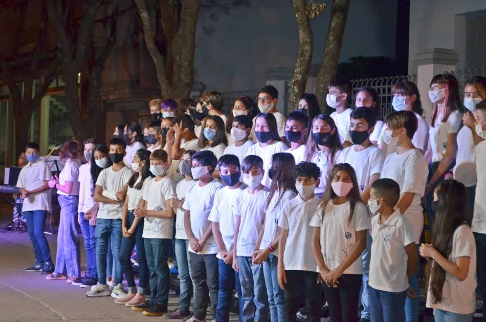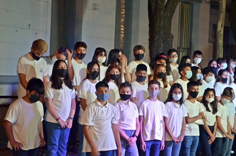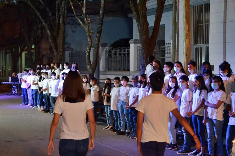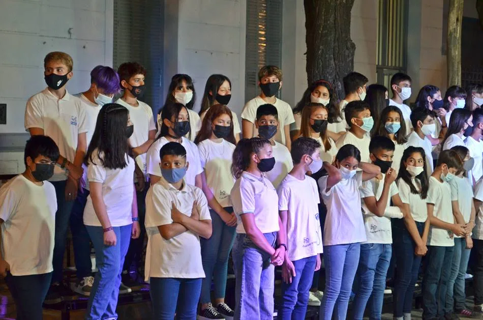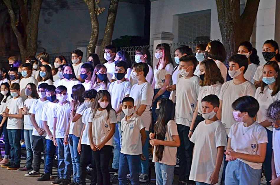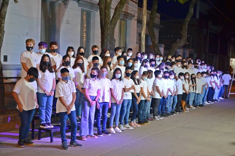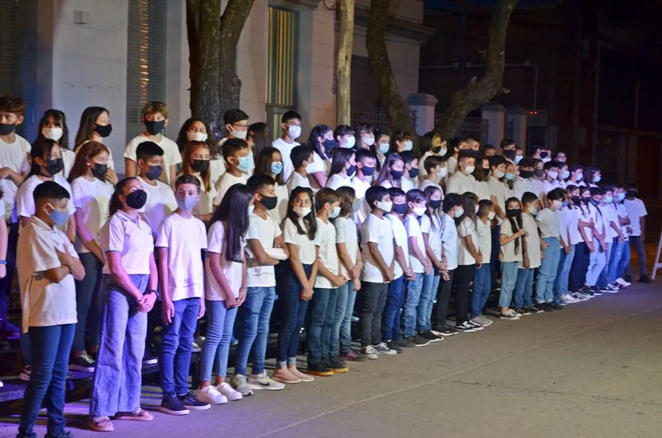 El himno nacional fue interpretado por las docentes Mariel Cabo y Andrea Bruno, del Liceo Municipal, y antes del discurso de despedida, se realizó el tradicional cambio de abanderados. Luego sí, los chicos recibieron el hasta siempre desde la entidad.