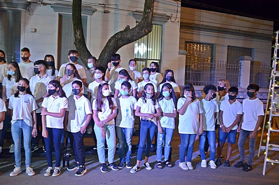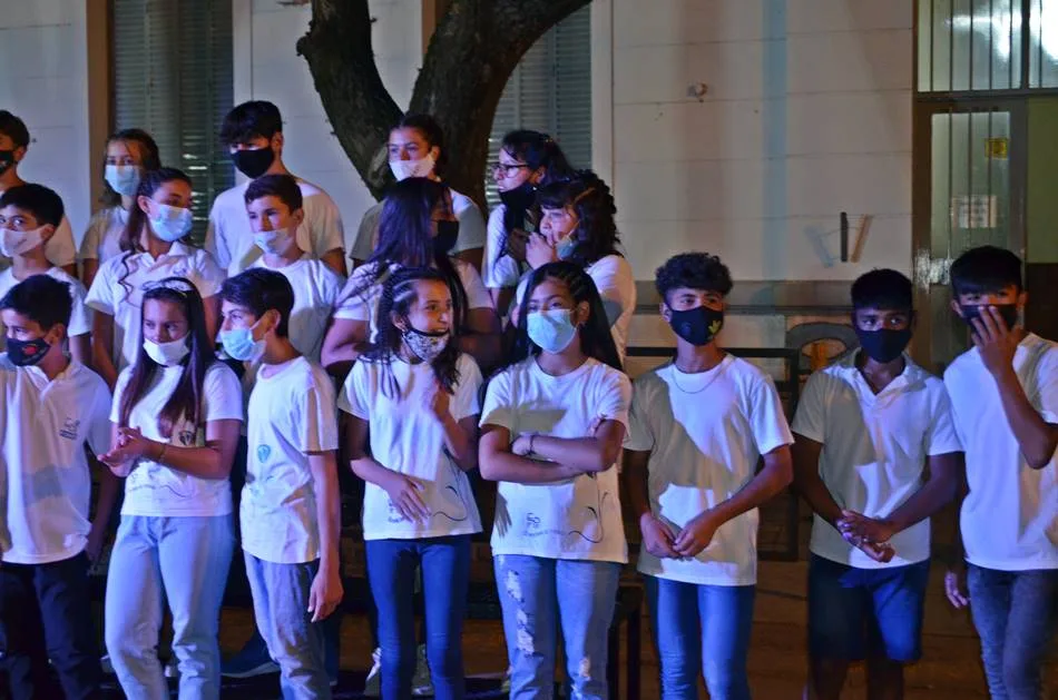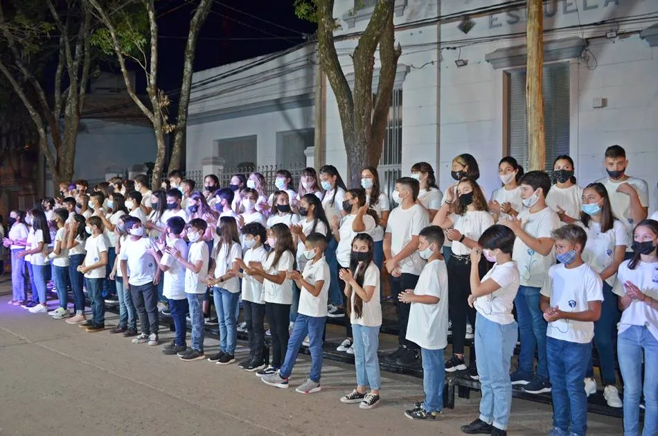 La comunidad educativa de la Escuela Nº 290 «Simón de Iriondo» dijo adiós este lunes por la noche a su promo 2021. Lo hizo en acto frente al establecimiento educativo, en la Avda. de Mayo, donde los familiares se ubicaron en el cantero central de la calle, y frente a ellos, los egresados en gradas.