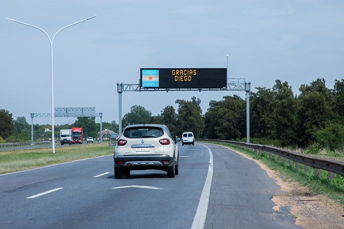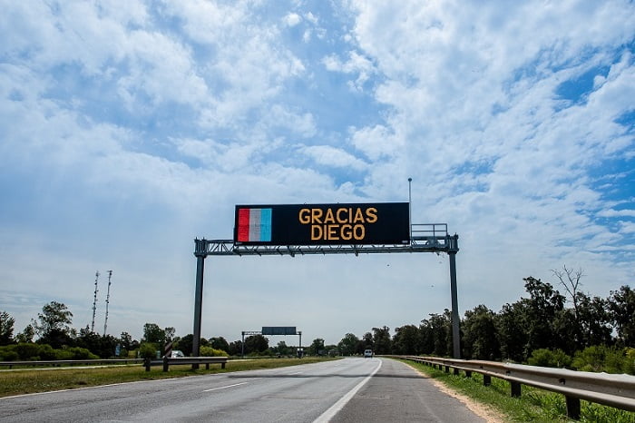 Los carteles electrónicos del tramo vial exhiben la leyenda “Gracias Diego”, con las banderas de Argentina y de Santa Fe, en memoria del futbolista más trascendente de nuestro país.