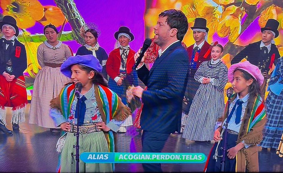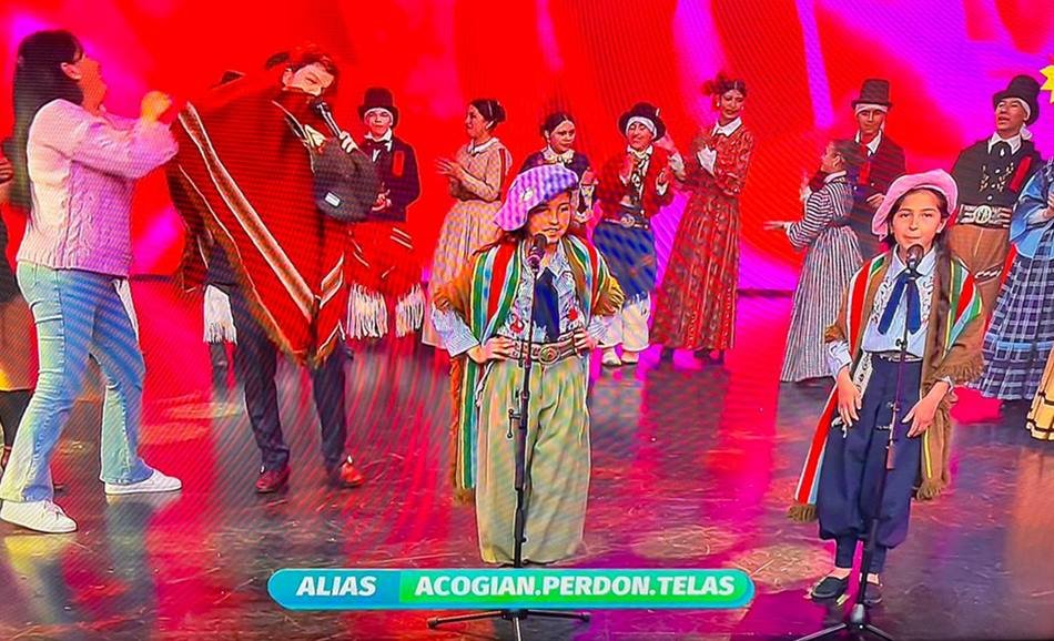 Hubo que esperarlas, pero finalmente, pasadas las 21:40 de este jueves, Martina y Valentina, o las Mellis Riquelme, se presentaron a puro folklore en Canal 13, en el programa BUENAS NOCHES FAMILIA, que conduce Guido Kaczka. Allí cantaron y hasta le regalaron un poncho y boina (lo que forma parte de su vestimenta) a Guido, quien se animó a bailar un poquito con Andrea, la mamá de las peques.