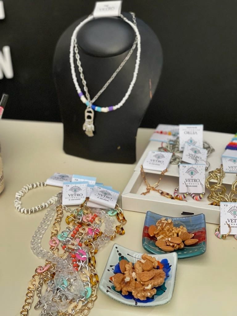 «Vetro Arte» – María Fernanda Pozzi utiliza cadenas de aluminio, fundición, mostacillas, cristales, hilos de seda, nácar y perlas y crea los accesorios más originales. Colores, brillos y diseño combinados para crear piezas únicas.