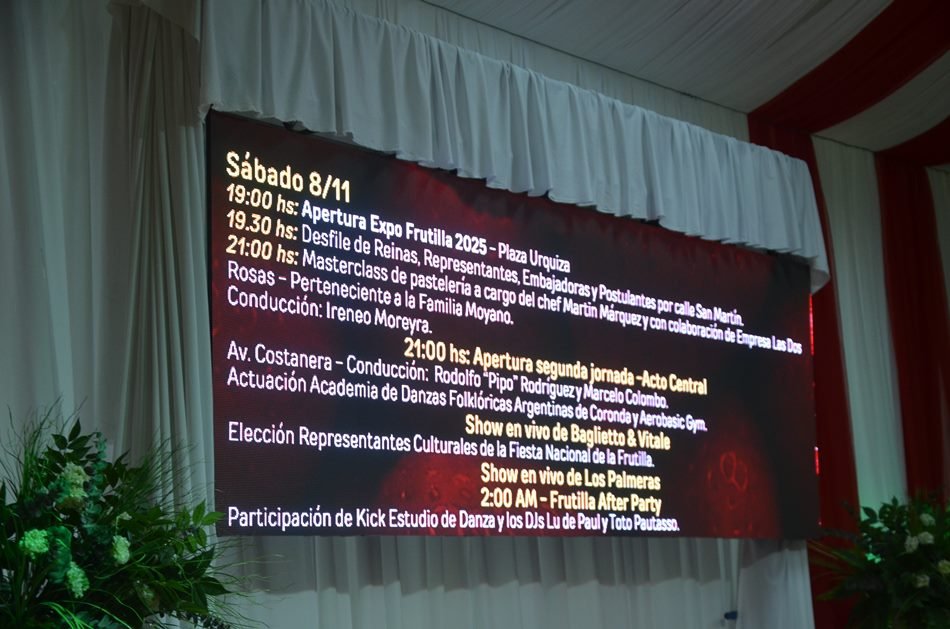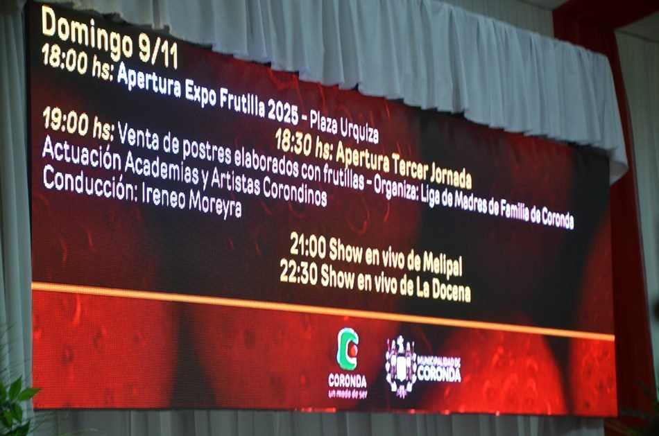 «Esta presentación es un primer pasito, sobre todo para mostrar el trabajo, la pasión y el compromiso que tenemos con nuestro fruto, al que nosotros le decimos el ‘rubí vegetal’ porque realmente nos representa como esa fruta magna, y la celebramos hace ya ciento cuatro años produciendo frutillas», sostuvo Belén Sierra, subsecretaria de Producción de Coronda, para luego dar detalles de lo que se vivirá este año los días centrales del evento: 7, 8 y 9 de noviembre: «Vamos a tener el viernes 7 la premiación del concurso de juntadores de frutillas, el concurso de empalillado, un concurso de postres con la chef Mirtha Carabajal de la ciudad de Buenos Aires, y también con Martín Márquez, un pastelero a quien pueden ver en vivo, mostrando su actividad. El show principal de música, que es libre y gratuito en la Plaza Urquiza, es con el grupo Alegría y con Gerardo Farías. El día sábado 8 seguimos con todo lo que son los doscientos puestos que tenemos de artesanos, emprendedores, gastronomía y la carpa de Producción, que para nosotros es fundamental porque muestra el trabajo del sector. Vamos a tener una masterclass y sorpresas muy, muy importantes, y además el show de Baglietto-Vitale y Los Palmeras, para finalmente, también para un público que captamos a partir del año pasado, vivir lo que es la after party, con dos DJs en vivo para que puedan disfrutar los más jóvenes y aquellos que también se quieran quedar después a disfrutarlo. Y ya el domingo, son los artistas locales, están las academias, show en vivo de MeliPal, que es un grupo de acá de la localidad, y La Docena».