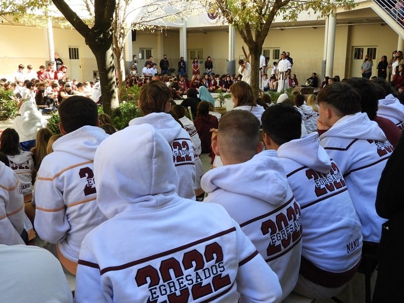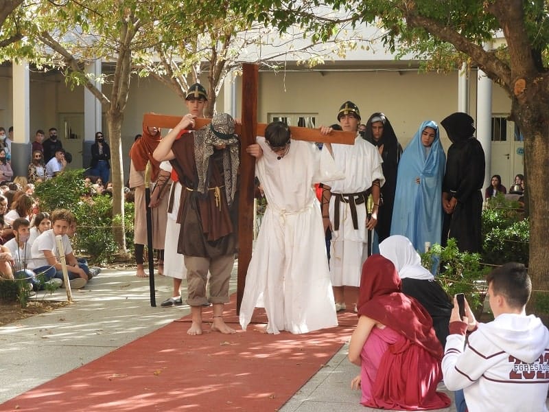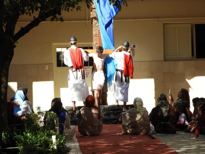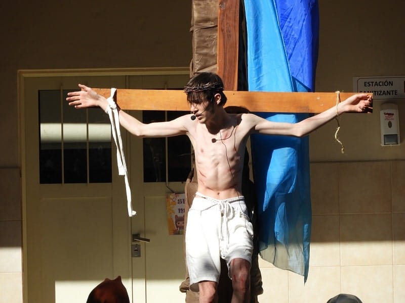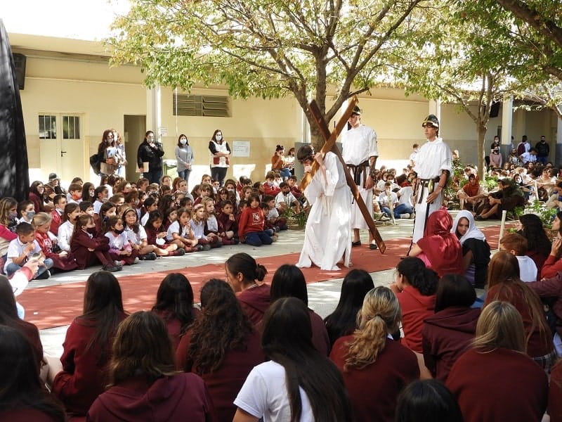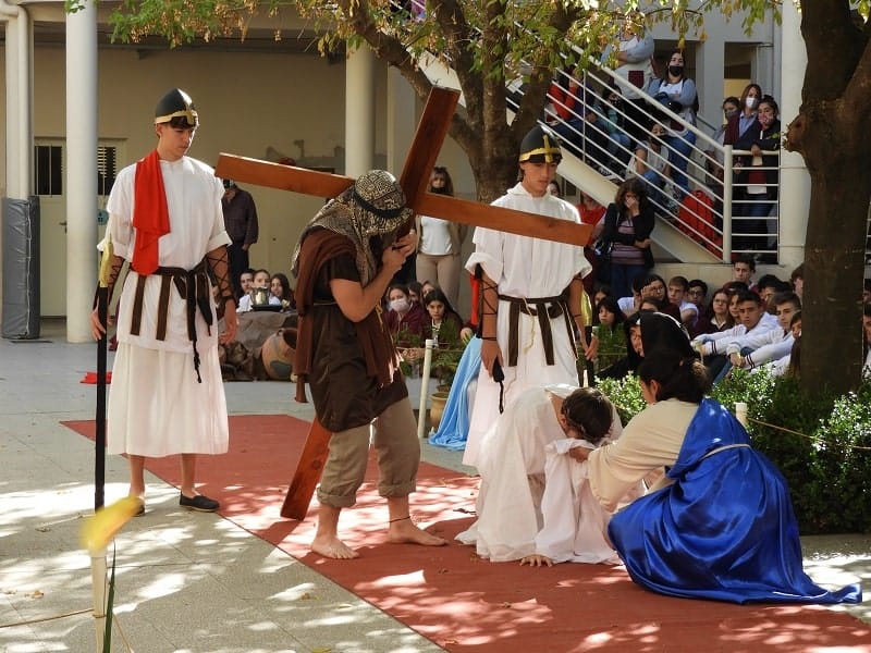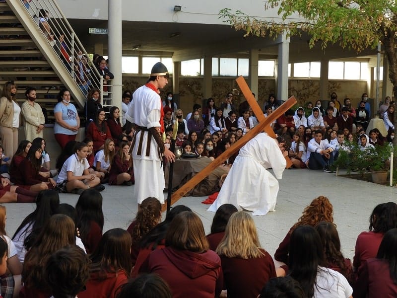 Alumnos de 5to año del nivel secundario del Colegio Nuestra Señora del Calvario representaron el Vía Crucis este miércoles por la tarde en el patio de la institución. Una esmerada puesta en escena de los estudiantes hizo el recorrido de las estaciones de la cruz en el camino de Jesús al Calvario. El Nivel Inicial, Primario y Terciario, junto a los docentes y personal de la entidad formaron parte del público que disfrutó de la representación católica.