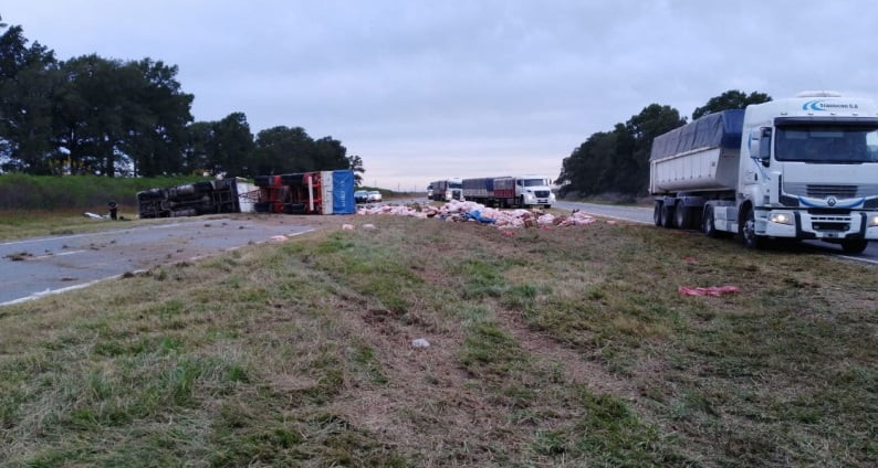 En fecha 11 del actual, siendo las 17:45 horas se tomó conocimiento sobre siniestro vial en el Km 58 de la Autopista Brigadier López, allí se produjo el vuelco de un camión con acoplado cargado con verdura conducido por un hombre de 36 años, acompañado por otro de 29 años de edad, ambos domiciliados en la localidad de Cayasta, rovincia de Santa Fe. Dando cuenta el chofer del vehículo que se conducía con dirección cardinal de Norte a Sur con destino a provincia de Buenos Aires cuando se le reventó una cubierta del camión, razón por la que perdió el control de su conducido cruzando al carril contrario, volcando el mismo quedando los dos carriles de circulación con sentido Sur a Norte (Rosario-Santa Fe) totalmente obstaculizados por el acoplado. Seguidamente se comisiona una unidad sanitaria con personal del SAMCo local, el cual no constató lesiones en los ocupantes del camión. Finalmente se hace presente personal de Vial Santa Fe los cuales proceden a la señalización del lugar para evitar que se produzca un nuevo siniestro vial. Siendo las 19:00 horas se normalizó la circulación de la autopista.